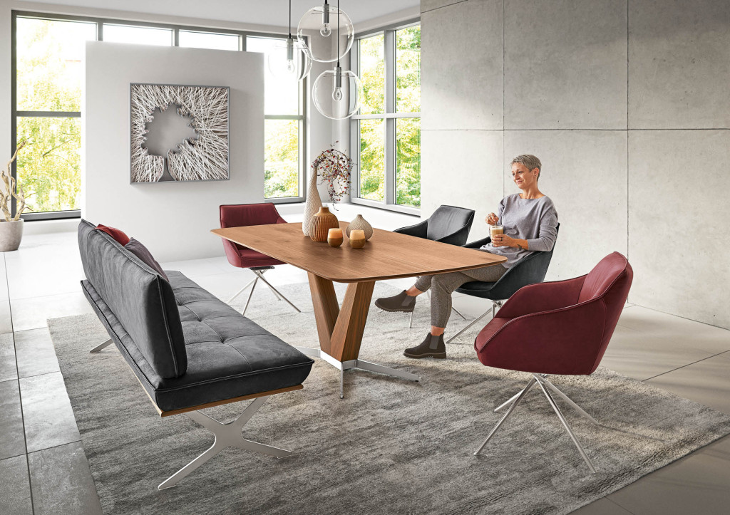 Bezug 1 Leder A, INDIA muskat, Bezug 2 Stoff 16, LODEN 39, Kontrastfaden beige 1222, Rücken DS2, Rücken mit Abstandshalter, Käntchennaht umlaufend, Untergestell Nr. 10, W-Gestell Rundrohr pulverbeschichtet struktur schwarz matt, Rahmen niedrig (2cm) in Wildeiche natur furniert, Abstandhalter durchgehend in Wildeiche natur furniert, Sitzhöhe ca. 49cm, Sitztiefe ca. 47cm