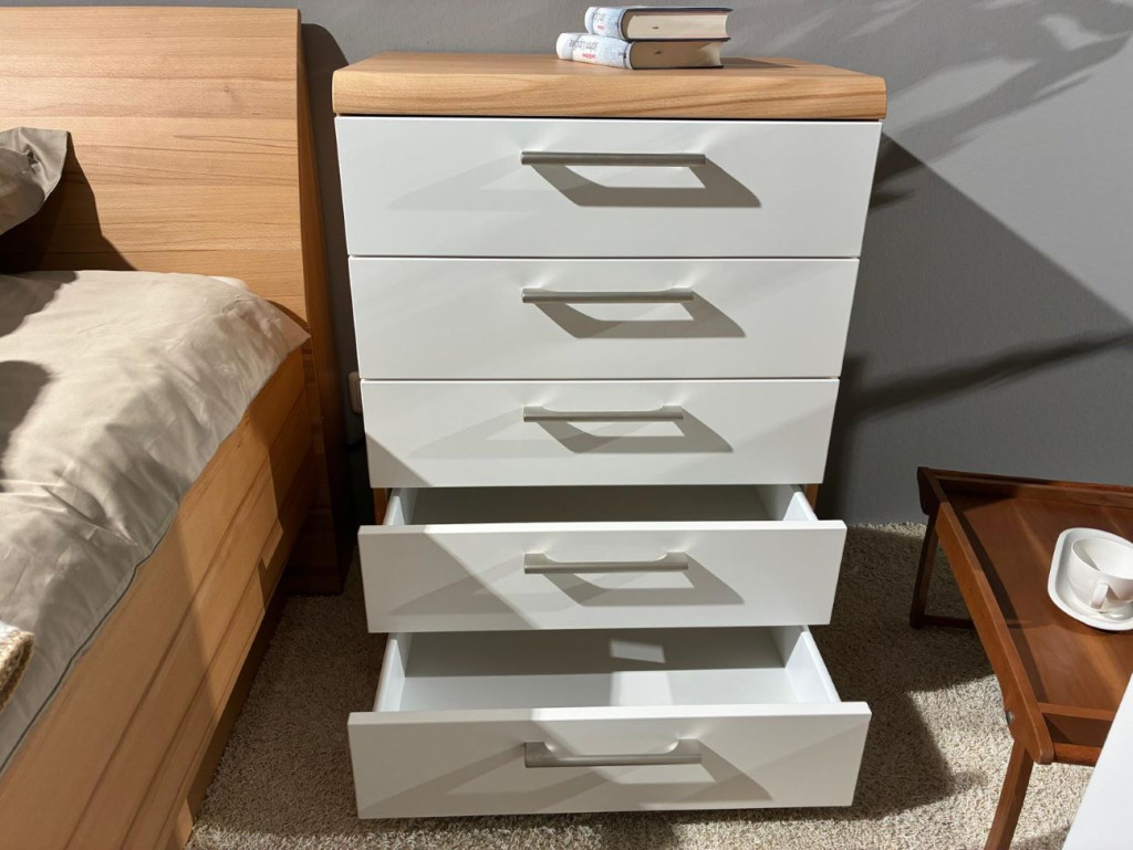 in der 9659 Ausführung Kernbuche/Lack weiß (PG 1), Korpus innen weiß, Griff 90956 N4 (Soft, Nickel matt), 5 Schubkästen, Nr. 25006