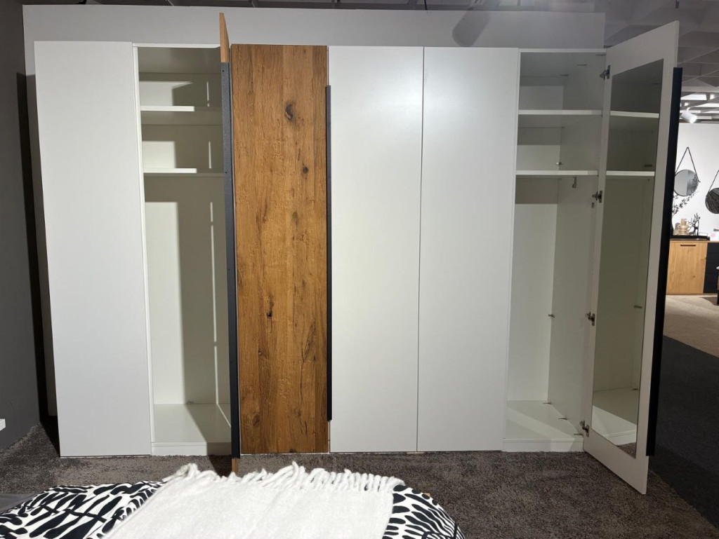 in Lack weiß, Absetzung Balkeneiche gehackt, Metallvariante anthrazit, 6-türig, 2 Türen in Balkeneiche gehackt, 4 Türen in Lack weiß, Nr. 575062