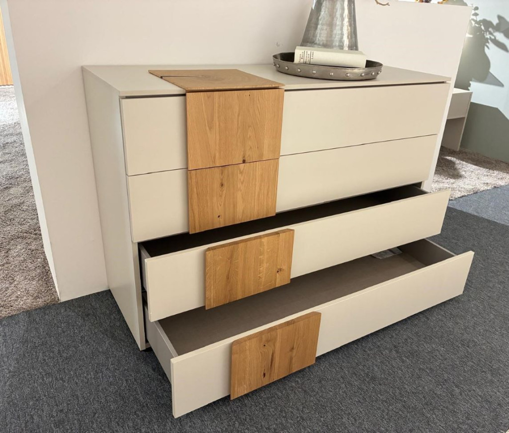 Korpus und Front Champagner, Frontabsetzungen Asteiche massiv, AG876, Absetzung Oberboden Hirnholz massiv, 4 Schubkästen, Nr. 61Z9